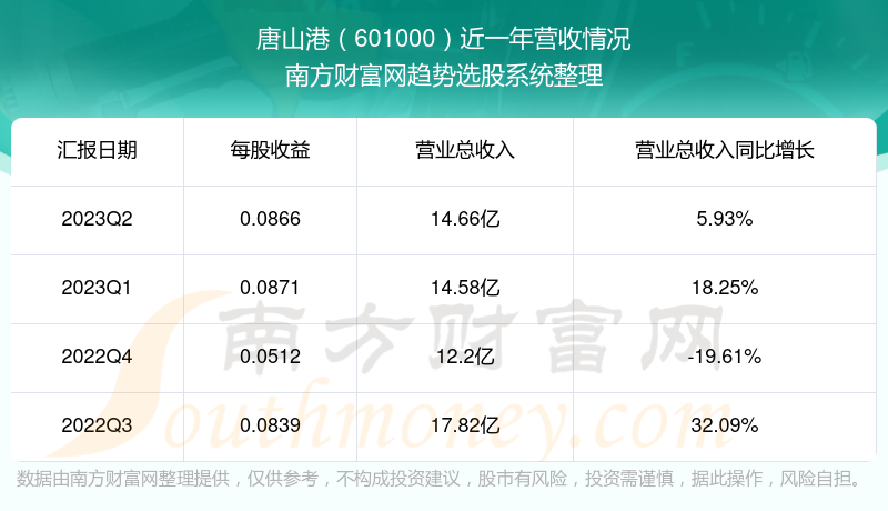 按照南方财富网趋势选股系统统计,该股所属板块为航运港口板块,该板块共有22只股票,唐山港2023第二季度营收在该板块中排名为第22名,该板块2023第二季度营收排名前十的股票如下表: