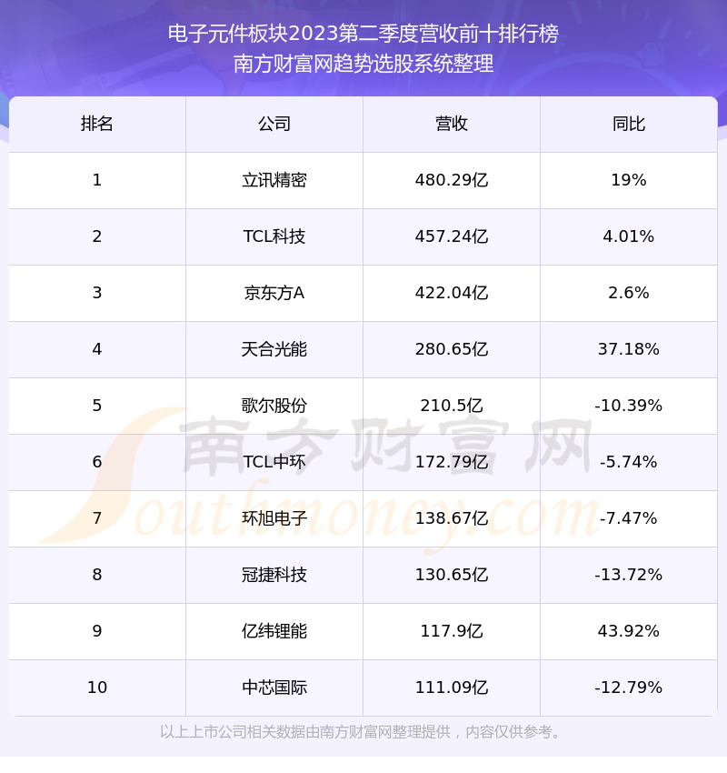 按照南方财富网趋势选股系统统计,该股所属板块为电子元件板块,该板块共有355只股票,法拉电子2023第二季度营收在该板块中排名为第98名,该板块2023第二季度营收排名前十的股票如下表: