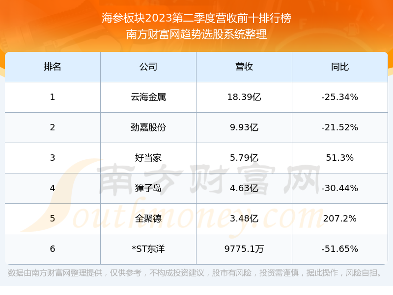 按照南方财富网趋势选股系统统计,该股所属板块为海参板块,该板块共有6只股票,好当家2023第二季度营收在该板块中排名为第3名,该板块2023第二季度营收排名前十的股票如下表: