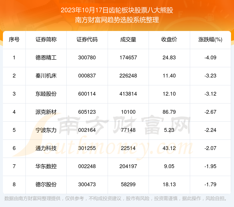 截止2023年10月17日,个股表现方面,齿轮板块股票当日领跌股为德恩精工(300780),该股当日报收24.83,上涨-4.09%,成交量17.47万。秦川机床(000837)以下跌-3.23%紧随其后,该股当日成交量22.62万。此外,东睦股份(600114)、派克新材(605123)、宁波东力(002164)均进入当日齿轮板块股票熊股之列。