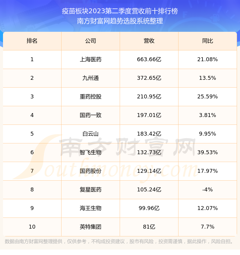 按照南方财富网趋势选股系统统计,该股所属板块为疫苗板块,该板块共有95只股票,万泰生物2023第二季度营收在该板块中排名为第39名,该板块2023第二季度营收排名前十的股票如下表:
