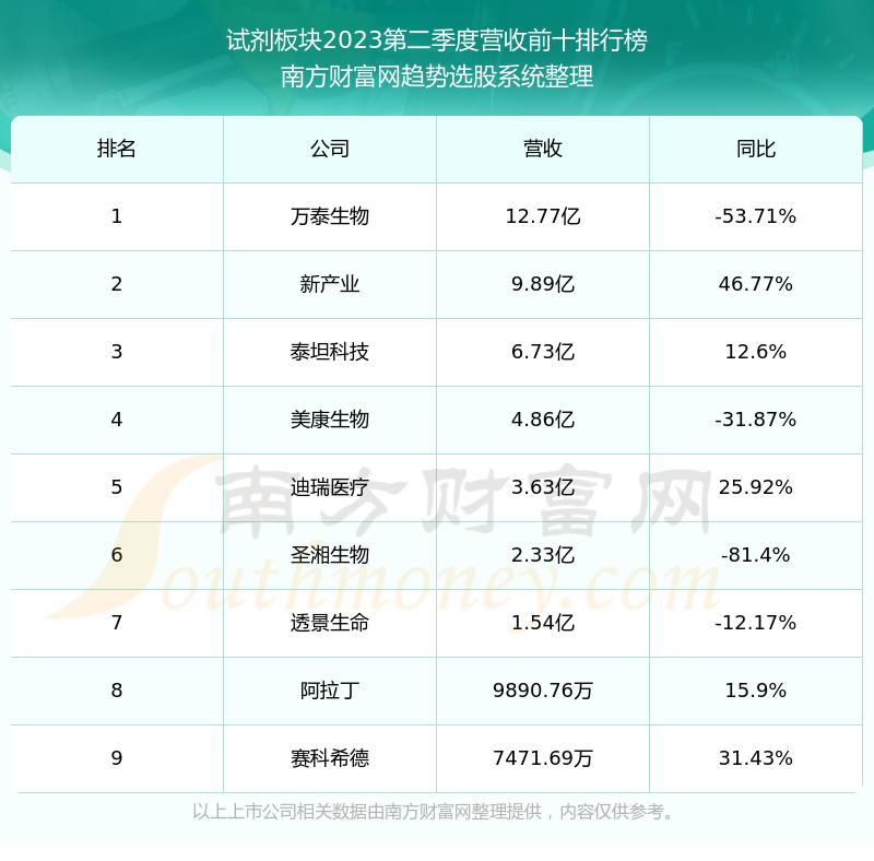 按照南方财富网趋势选股系统统计,该股所属板块为试剂板块,该板块共有9只股票,仁度生物2023第二季度营收在该板块中排名为第9名,该板块2023第二季度营收排名前十的股票如下表:
