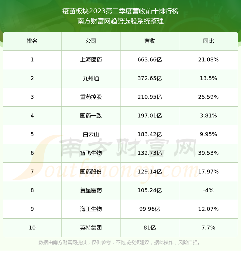 按照南方财富网趋势选股系统统计,该股所属板块为疫苗板块,该板块共有95只股票,康希诺2023第二季度营收在该板块中排名为第95名,该板块2023第二季度营收排名前十的股票如下表: