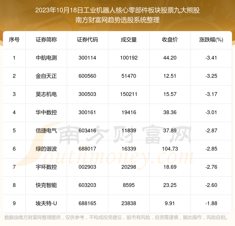 以上内容就是对【股票配资APP 数据解盘|2023年10月18日工业机器人核心零部件板块股票九大熊股一览】的解答,如果解决了您的问题欢迎把链接分享给朋友(https://www.youge168.com/mod_article-article_content-article_id-48671.html)