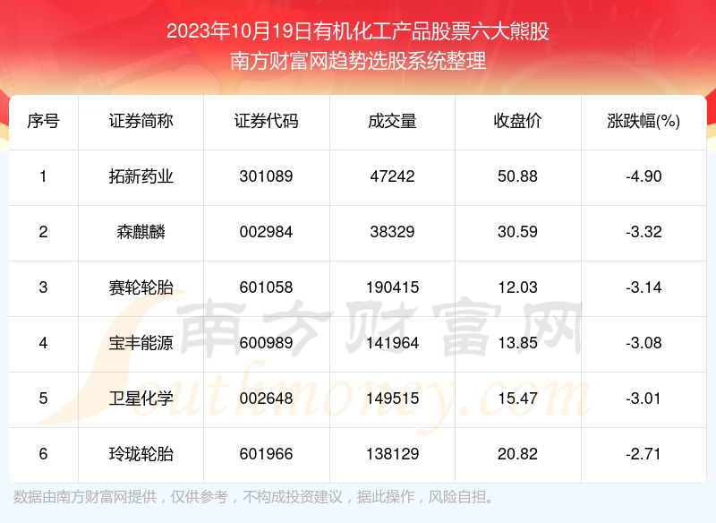 截止2023年10月19日,个股表现方面,有机化工产品股票当日领跌股为拓新药业(301089),该股当日报收50.88,上涨-4.90%,成交量4.72万。森麒麟(002984)以下跌-3.32%紧随其后,该股当日成交量3.83万。此外,赛轮轮胎(601058)、宝丰能源(600989)、卫星化学(002648)均进入当日有机化工产品股票熊股之列。