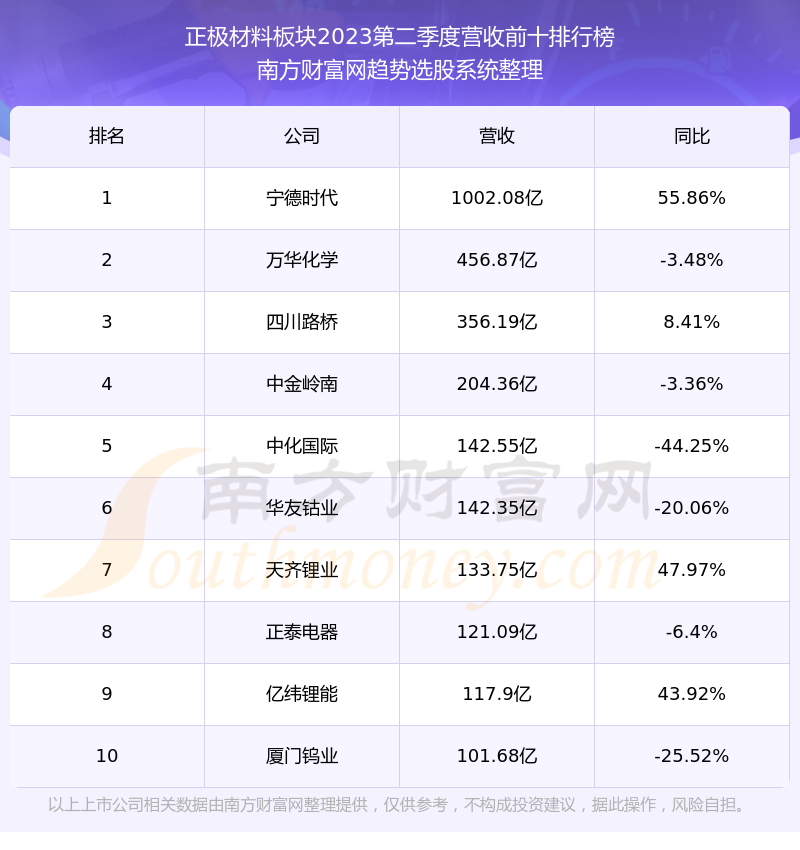按照南方财富网趋势选股系统统计,该股所属板块为正极材料板块,该板块共有79只股票,容百科技2023第二季度营收在该板块中排名为第22名,该板块2023第二季度营收排名前十的股票如下表: