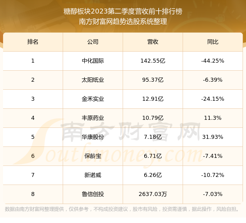按照南方财富网趋势选股系统统计,该股所属板块为糖醇板块,该板块共有8只股票,华康股份2023第二季度营收在该板块中排名为第5名,该板块2023第二季度营收排名前十的股票如下表: