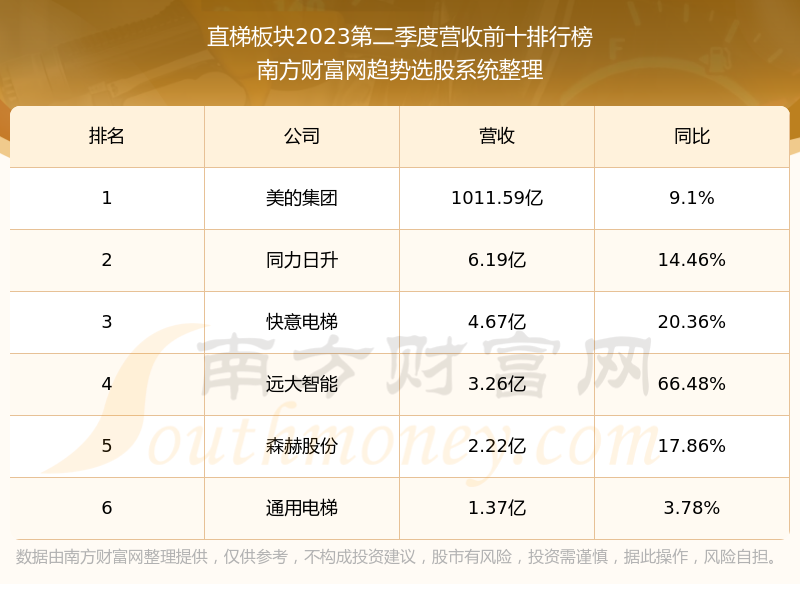 按照南方财富网趋势选股系统统计,该股所属板块为直梯板块,该板块共有6只股票,梅轮电梯2023第二季度营收在该板块中排名为第6名,该板块2023第二季度营收排名前十的股票如下表:
