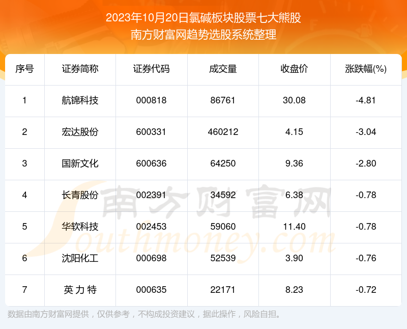 截止2023年10月20日,个股表现方面,氯碱板块股票当日领跌股为航锦科技(000818),该股当日报收30.08,上涨-4.81%,成交量8.68万。宏达股份(600331)以下跌-3.04%紧随其后,该股当日成交量46.02万。此外,国新文化(600636)、长青股份(002391)、华软科技(002453)均进入当日氯碱板块股票熊股之列。