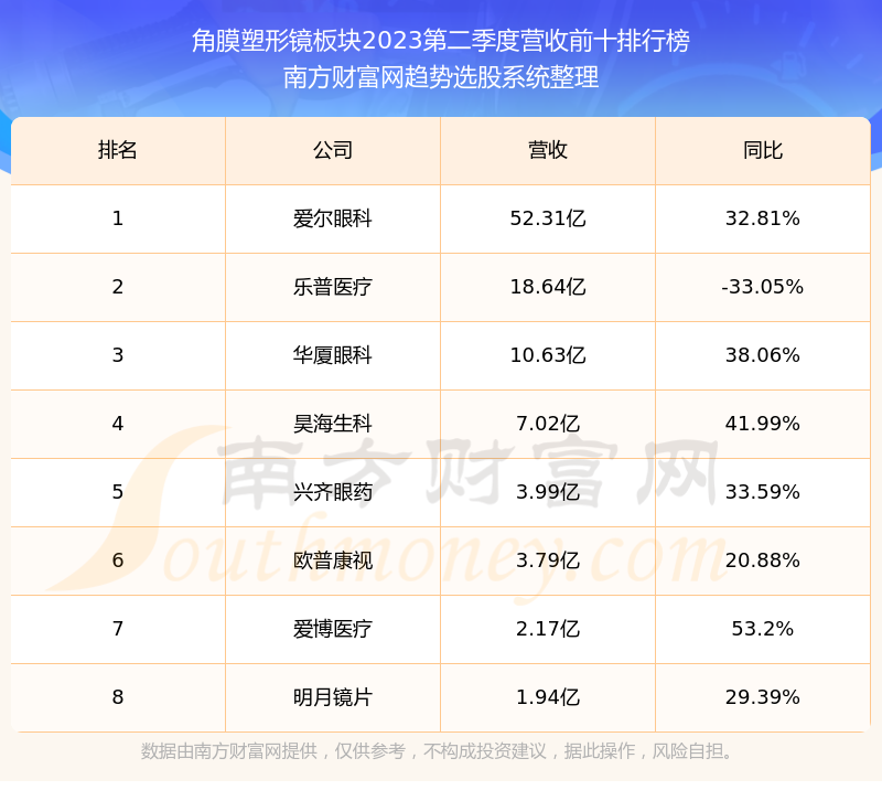 按照南方财富网趋势选股系统统计,该股所属板块为角膜塑形镜板块,该板块共有8只股票,爱博医疗2023第二季度营收在该板块中排名为第7名,该板块2023第二季度营收排名前十的股票如下表: