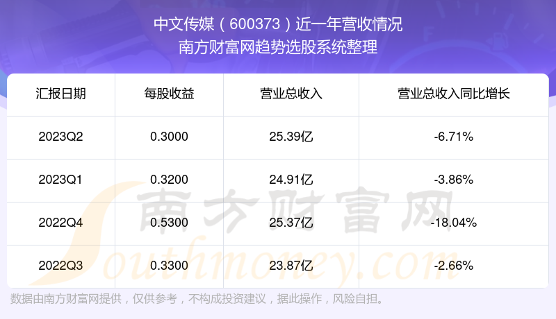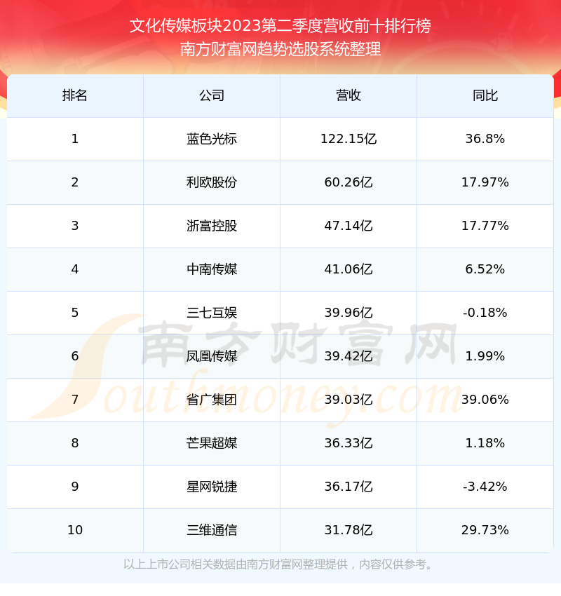 按照南方财富网趋势选股系统统计,该股所属板块为文化传媒板块,该板块共有250只股票,中文传媒2023第二季度营收在该板块中排名为第22名,该板块2023第二季度营收排名前十的股票如下表:
