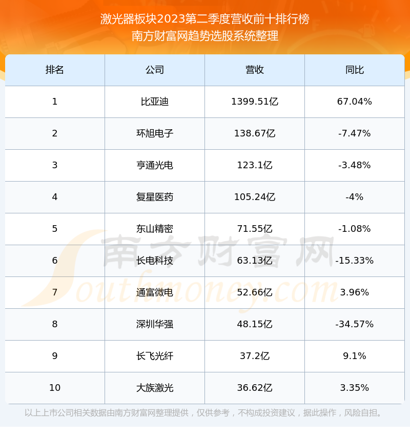 按照南方财富网趋势选股系统统计,该股所属板块为激光器板块,该板块共有56只股票,杰普特2023第二季度营收在该板块中排名为第36名,该板块2023第二季度营收排名前十的股票如下表: