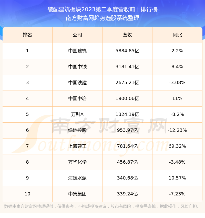 按照南方财富网趋势选股系统统计,该股所属板块为装配建筑板块,该板块共有92只股票,安徽建工2023第二季度营收在该板块中排名为第14名,该板块2023第二季度营收排名前十的股票如下表: