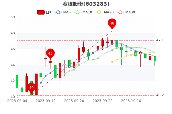 当前市值89.24亿。10月23日消息,赛腾股份开盘报45.13元,截至下午3点收盘,该股跌1.44%报44.480元。