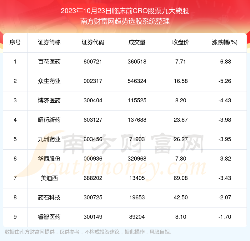 截止2023年10月23日,个股表现方面,临床前CRO股票当日领跌股为百花医药(600721),该股当日报收7.71,上涨-6.88%,成交量36.05万。众生药业(002317)以下跌-5.26%紧随其后,该股当日成交量54.63万。此外,博济医药(300404)、昭衍新药(603127)、九洲药业(603456)均进入当日临床前CRO股票熊股之列。