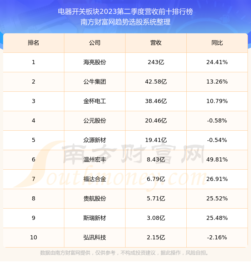 按照南方财富网趋势选股系统统计,该股所属板块为电器开关板块,该板块共有11只股票,贵航股份2023第二季度营收在该板块中排名为第8名,该板块2023第二季度营收排名前十的股票如下表: