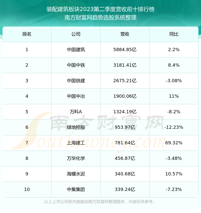 按照南方财富网趋势选股系统统计,该股所属板块为装配建筑板块,该板块共有92只股票,宁波建工2023第二季度营收在该板块中排名为第25名,该板块2023第二季度营收排名前十的股票如下表: