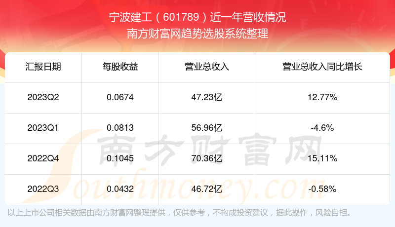 宁波建工2023年第二季度财报显示,公司主营收入47.23亿元,同比12.77%;归母净利润7768.74万元,同比13.2%;扣非净利润5814.41万元,同比1.84%。