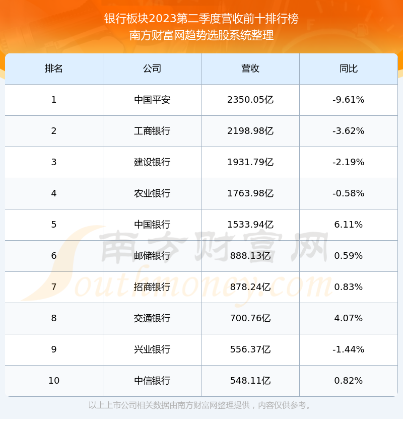按照南方财富网趋势选股系统统计,该股所属板块为银行板块,该板块共有44只股票,工商银行2023第二季度营收在该板块中排名为第2名,该板块2023第二季度营收排名前十的股票如下表: