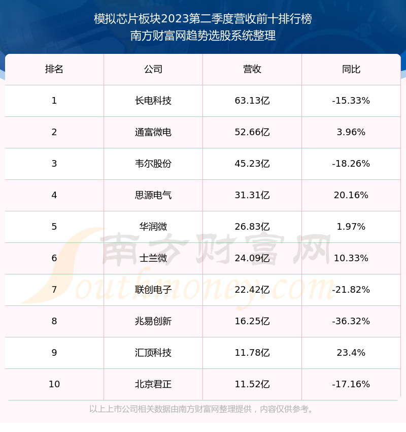 按照南方财富网趋势选股系统统计,该股所属板块为模拟芯片板块,该板块共有29只股票,思瑞浦2023第二季度营收在该板块中排名为第22名,该板块2023第二季度营收排名前十的股票如下表: