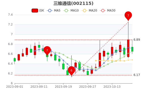 10月20日收盘消息,三维通信3日内股价上涨0.9%,最新报6.650元,成交额4.56亿元。