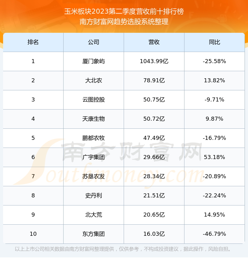按照南方财富网趋势选股系统统计,该股所属板块为玉米板块,该板块共有22只股票,万向德农2023第二季度营收在该板块中排名为第21名,该板块2023第二季度营收排名前十的股票如下表: