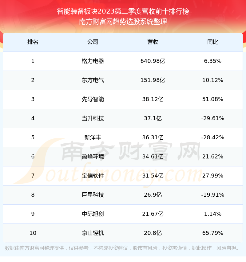 按照南方财富网趋势选股系统统计,该股所属板块为智能装备板块,该板块共有68只股票,中重科技2023第二季度营收在该板块中排名为第68名,该板块2023第二季度营收排名前十的股票如下表: