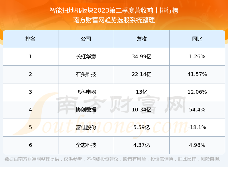 按照南方财富网趋势选股系统统计,该股所属板块为智能扫地机板块,该板块共有6只股票,石头科技2023第二季度营收在该板块中排名为第2名,该板块2023第二季度营收排名前十的股票如下表: