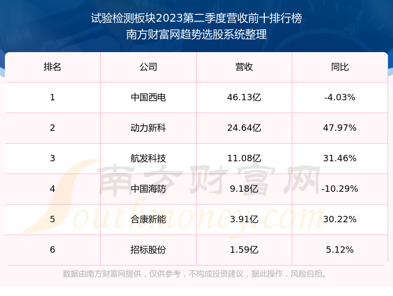 按照南方财富网趋势选股系统统计,该股所属板块为试验检测板块,该板块共有6只股票,南网科技2023第二季度营收在该板块中排名为第6名,该板块2023第二季度营收排名前十的股票如下表: