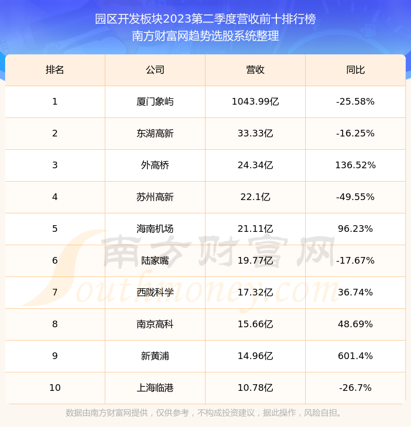 按照南方财富网趋势选股系统统计,该股所属板块为园区开发板块,该板块共有23只股票,张江高科2023第二季度营收在该板块中排名为第16名,该板块2023第二季度营收排名前十的股票如下表: