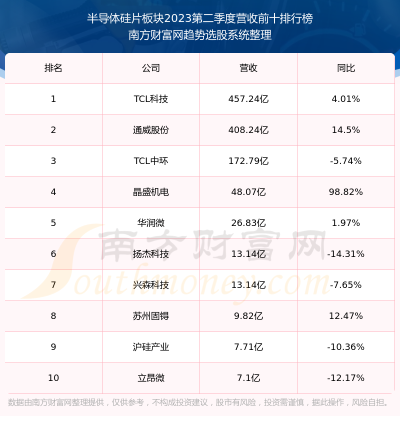 按照南方财富网趋势选股系统统计,该股所属板块为半导体硅片板块,该板块共有21只股票,立昂微2023第二季度营收在该板块中排名为第10名,该板块2023第二季度营收排名前十的股票如下表: