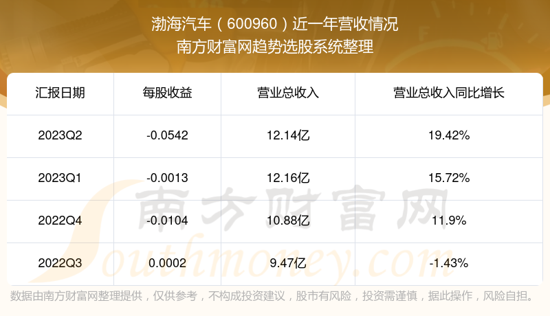 财报显示,2023年第二季度渤海汽车营收12.14亿元,同比增长19.42%,净利润-5147.81万元,同比增长-59.08%。
