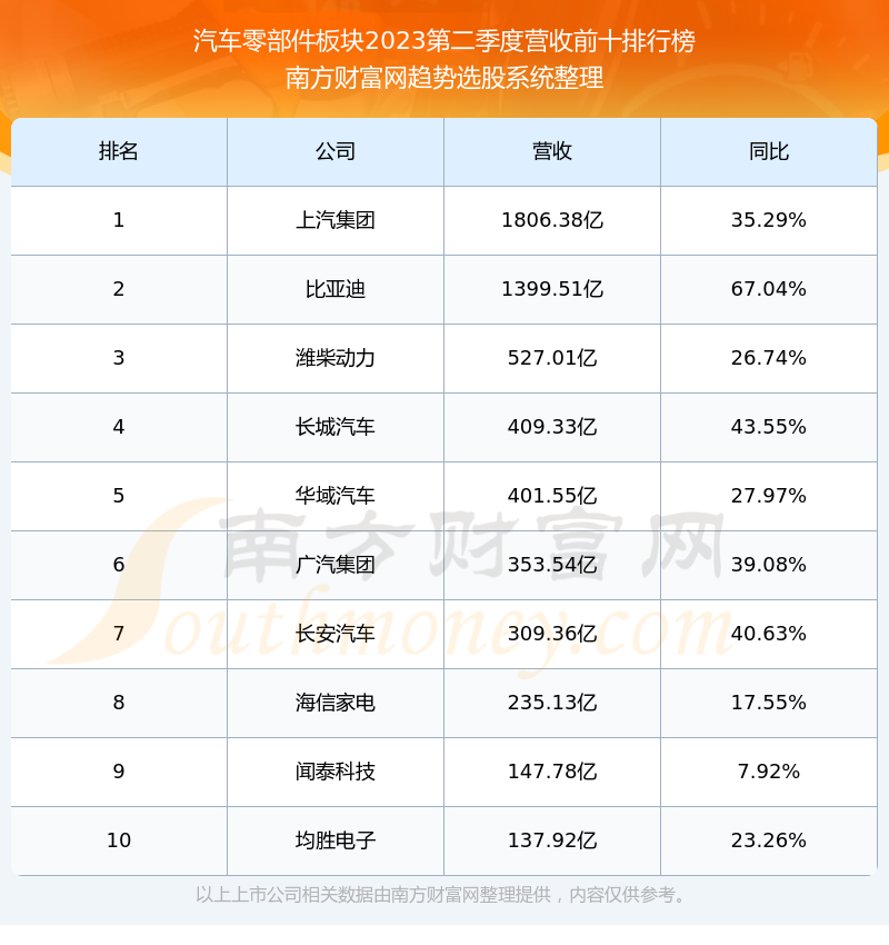 按照南方财富网趋势选股系统统计,该股所属板块为汽车零部件板块,该板块共有430只股票,渤海汽车2023第二季度营收在该板块中排名为第127名,该板块2023第二季度营收排名前十的股票如下表: