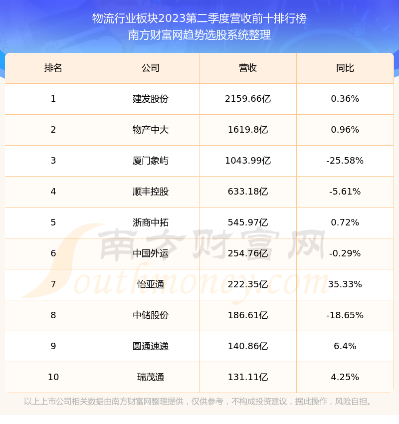 按照南方财富网趋势选股系统统计,该股所属板块为物流行业板块,该板块共有57只股票,厦门象屿2023第二季度营收在该板块中排名为第3名,该板块2023第二季度营收排名前十的股票如下表: