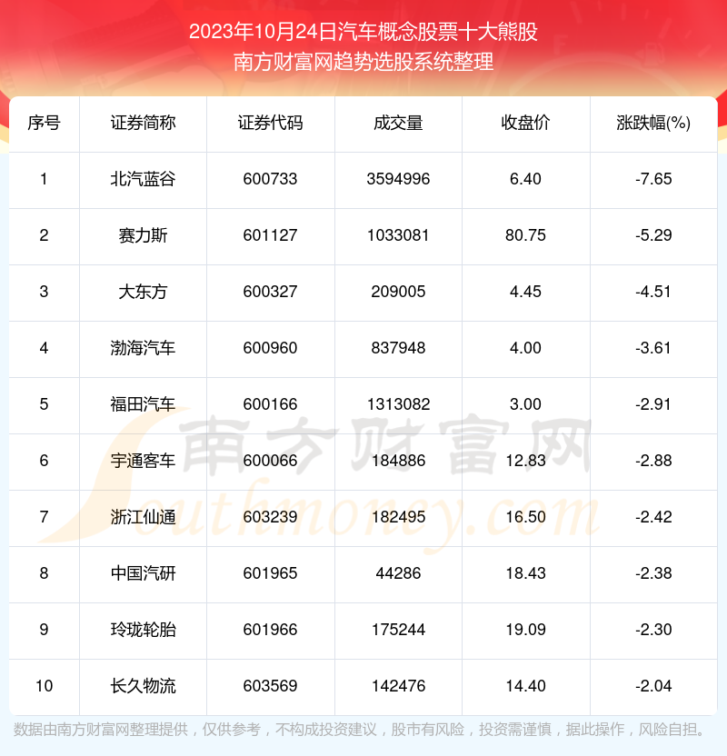 截止2023年10月24日,个股表现方面,汽车概念股票当日领跌股为北汽蓝谷(600733),该股当日报收6.40,上涨-7.65%,成交量359.5万。赛力斯(601127)以下跌-5.29%紧随其后,该股当日成交量103.31万。此外,大东方(600327)、渤海汽车(600960)、福田汽车(600166)均进入当日汽车概念股票熊股之列。