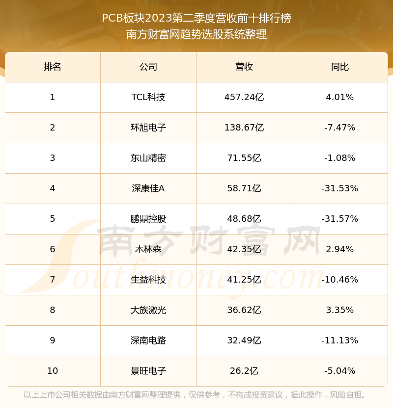 按照南方财富网趋势选股系统统计,该股所属板块为PCB板块,该板块共有89只股票,芯�微装2023第二季度营收在该板块中排名为第73名,该板块2023第二季度营收排名前十的股票如下表: