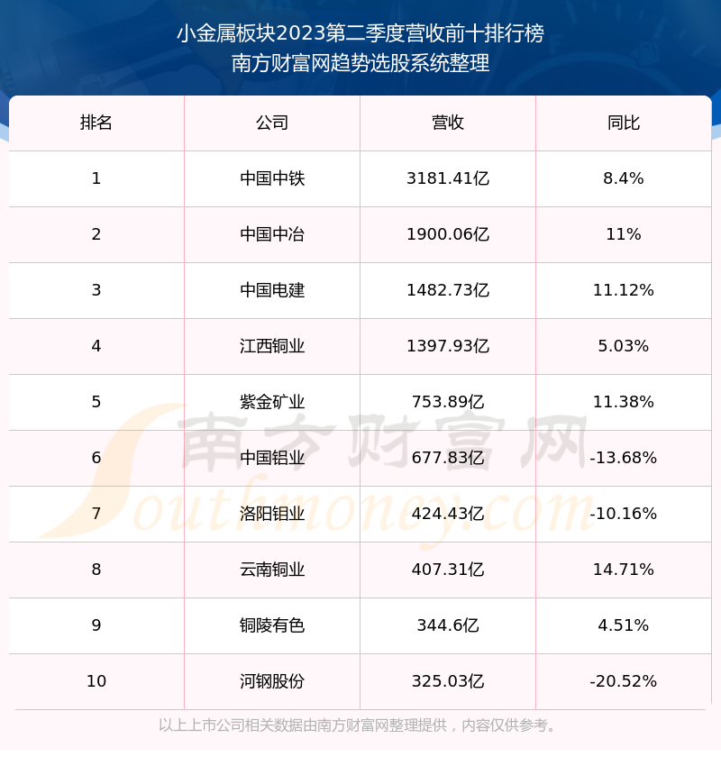 按照南方财富网趋势选股系统统计,该股所属板块为小金属板块,该板块共有158只股票,宝钛股份2023第二季度营收在该板块中排名为第67名,该板块2023第二季度营收排名前十的股票如下表: