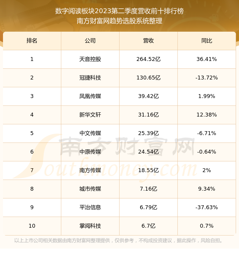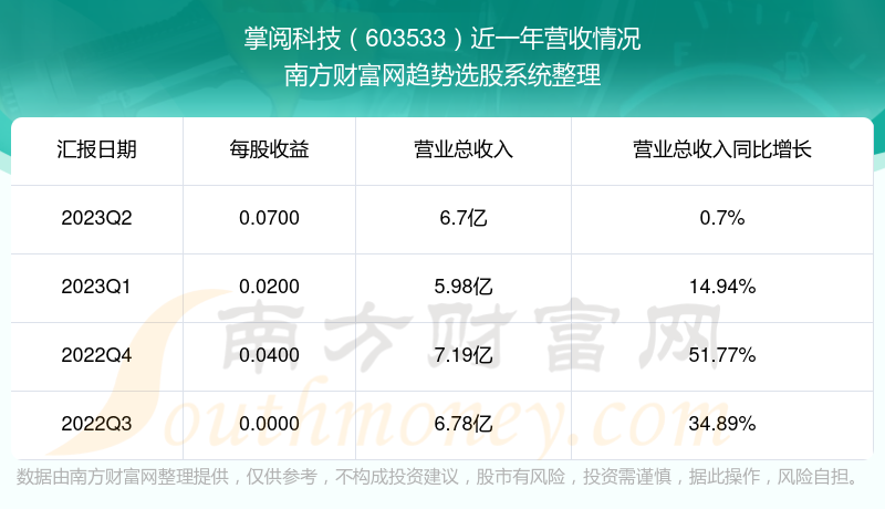 按照南方财富网趋势选股系统统计,该股所属板块为数字阅读板块,该板块共有19只股票,掌阅科技2023第二季度营收在该板块中排名为第10名,该板块2023第二季度营收排名前十的股票如下表: