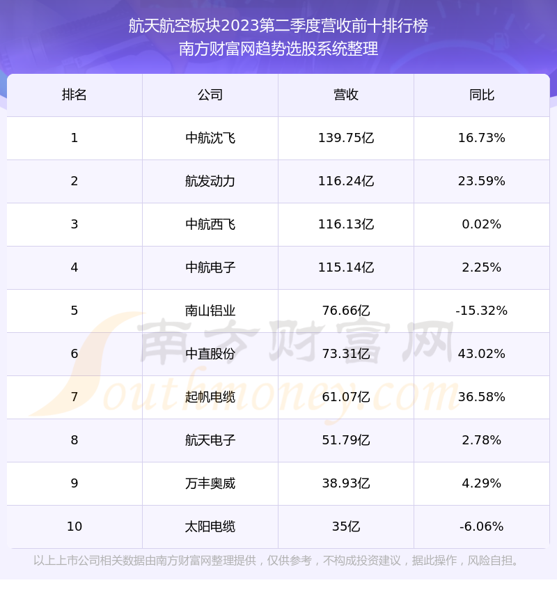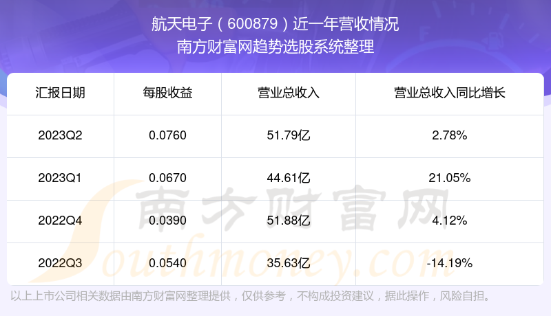 按照南方财富网趋势选股系统统计,该股所属板块为航天航空板块,该板块共有94只股票,航天电子2023第二季度营收在该板块中排名为第8名,该板块2023第二季度营收排名前十的股票如下表: