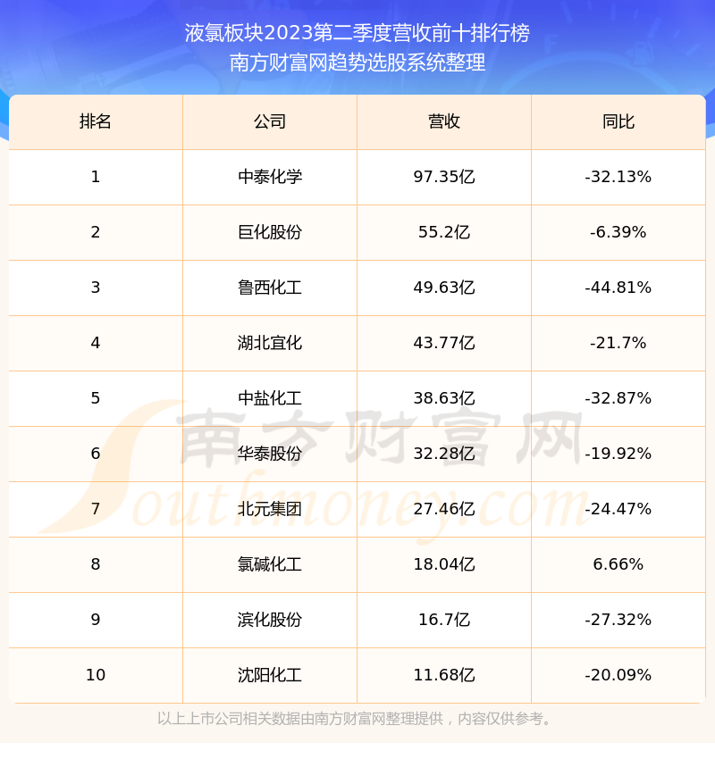 按照南方财富网趋势选股系统统计,该股所属板块为液氯板块,该板块共有15只股票,镇洋发展2023第二季度营收在该板块中排名为第15名,该板块2023第二季度营收排名前十的股票如下表: