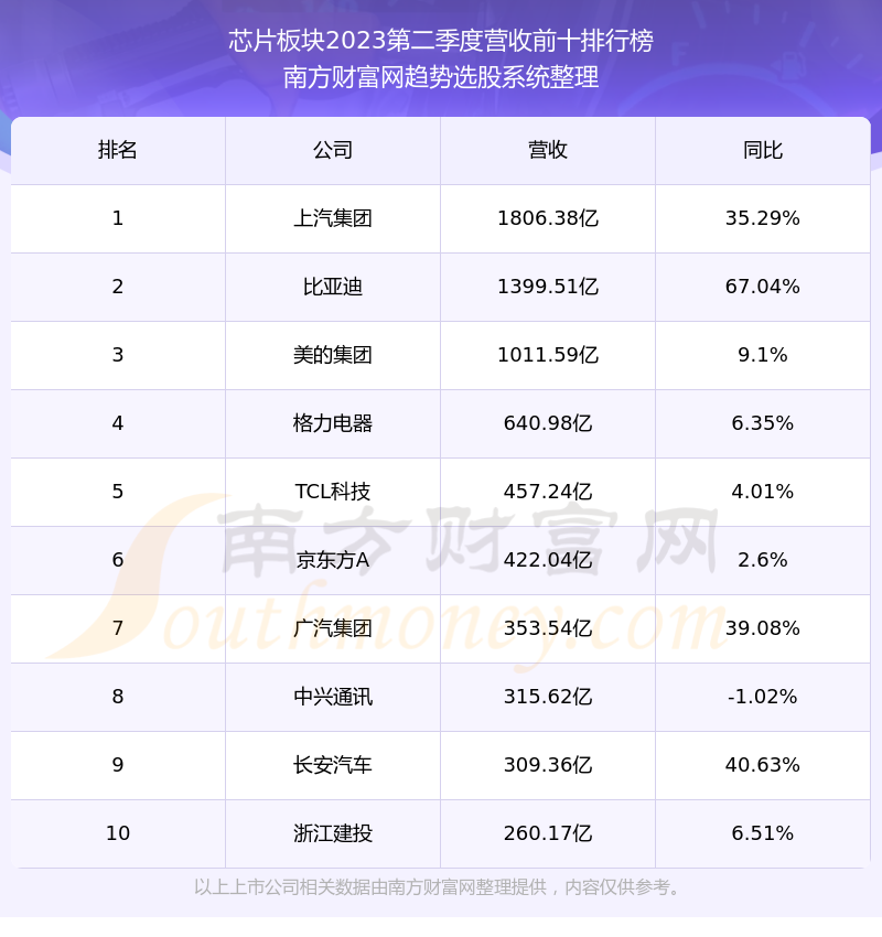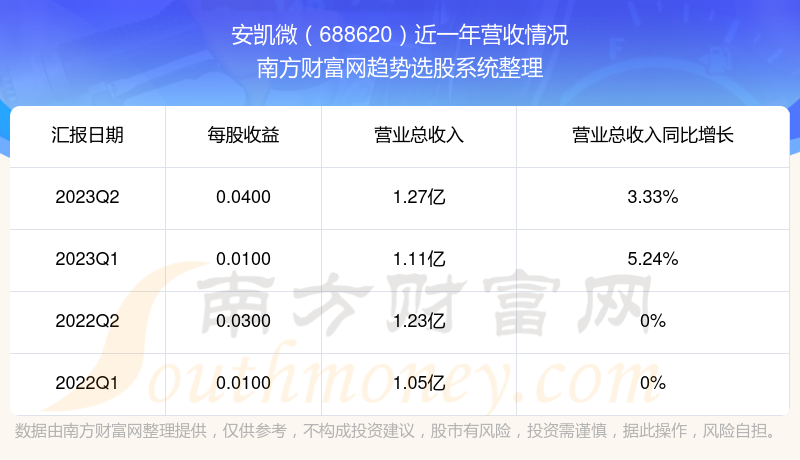 按照南方财富网趋势选股系统统计,该股所属板块为芯片板块,该板块共有496只股票,安凯微2023第二季度营收在该板块中排名为第496名,该板块2023第二季度营收排名前十的股票如下表: