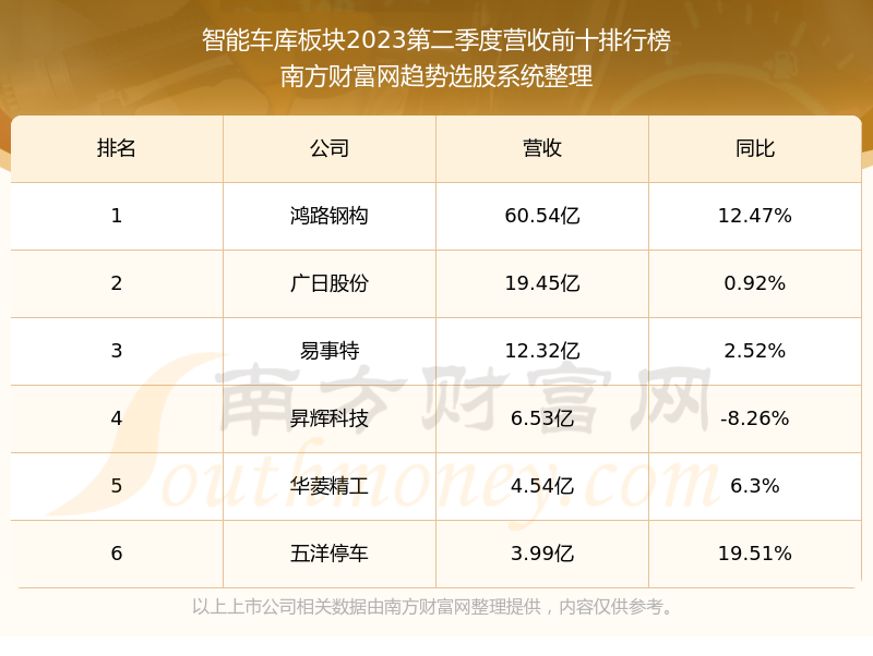 按照南方财富网趋势选股系统统计,该股所属板块为智能车库板块,该板块共有6只股票,华菱精工2023第二季度营收在该板块中排名为第5名,该板块2023第二季度营收排名前十的股票如下表: