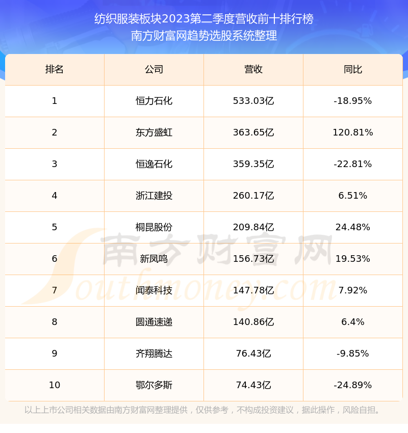 按照南方财富网趋势选股系统统计,该股所属板块为纺织服装板块,该板块共有176只股票,歌力思2023第二季度营收在该板块中排名为第71名,该板块2023第二季度营收排名前十的股票如下表: