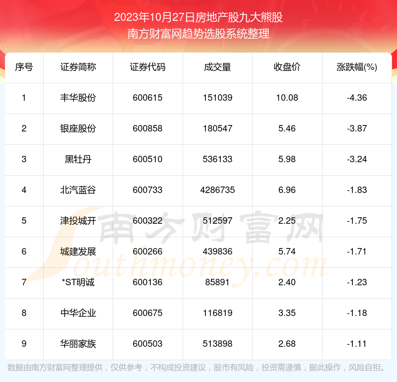 截止2023年10月27日,个股表现方面,房地产股当日领跌股为丰华股份(600615),该股当日报收10.08,上涨-4.36%,成交量15.1万。银座股份(600858)以下跌-3.87%紧随其后,该股当日成交量18.05万。此外,黑牡丹(600510)、北汽蓝谷(600733)、津投城开(600322)均进入当日房地产股熊股之列。