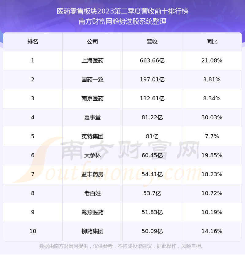按照南方财富网趋势选股系统统计,该股所属板块为医药零售板块,该板块共有19只股票,老百姓2023第二季度营收在该板块中排名为第8名,该板块2023第二季度营收排名前十的股票如下表: