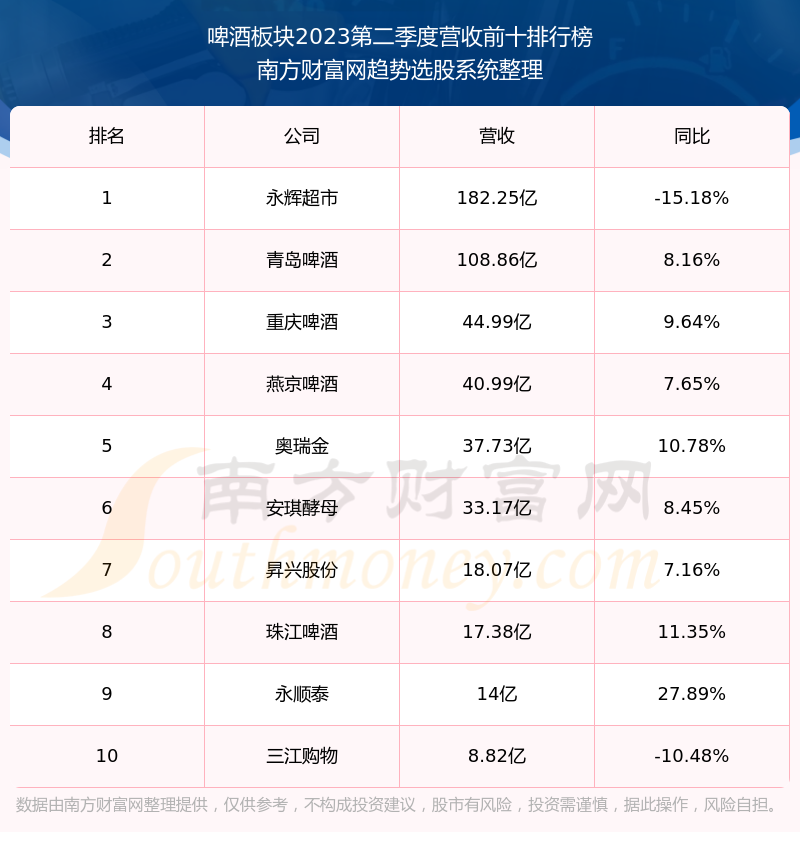 按照南方财富网趋势选股系统统计,该股所属板块为啤酒板块,该板块共有18只股票,青岛啤酒2023第二季度营收在该板块中排名为第2名,该板块2023第二季度营收排名前十的股票如下表: