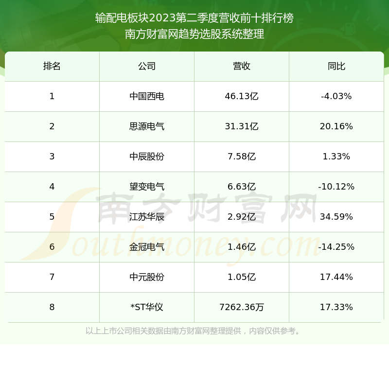 按照南方财富网趋势选股系统统计,该股所属板块为输配电板块,该板块共有8只股票,*ST华仪2023第二季度营收在该板块中排名为第8名,该板块2023第二季度营收排名前十的股票如下表: