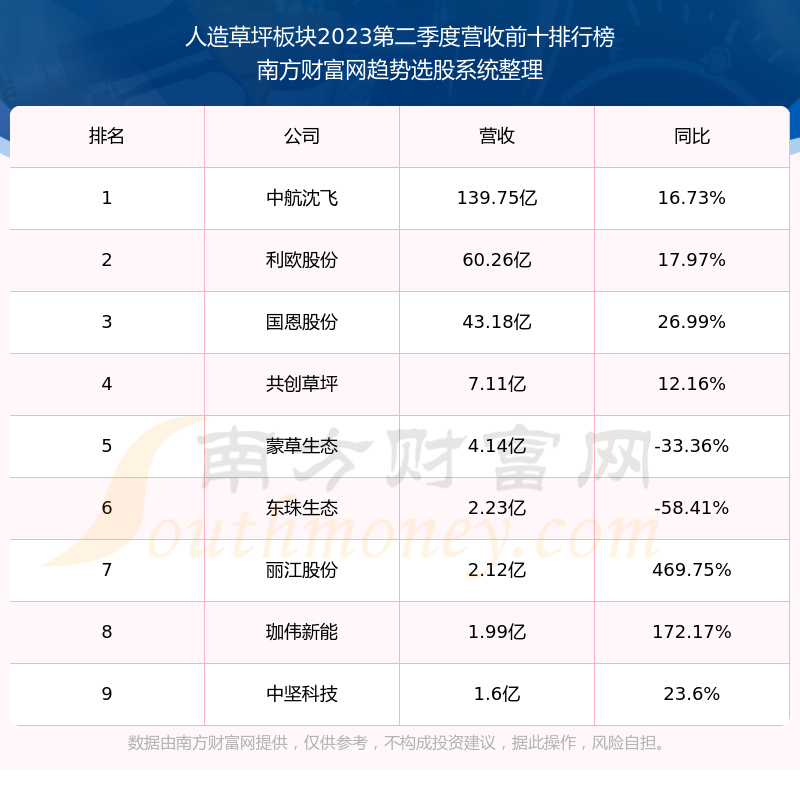 按照南方财富网趋势选股系统统计,该股所属板块为人造草坪板块,该板块共有9只股票,共创草坪2023第二季度营收在该板块中排名为第4名,该板块2023第二季度营收排名前十的股票如下表: