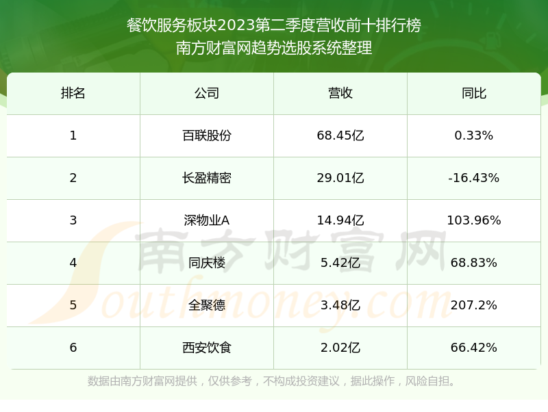 按照南方财富网趋势选股系统统计,该股所属板块为餐饮服务板块,该板块共有6只股票,同庆楼2023第二季度营收在该板块中排名为第4名,该板块2023第二季度营收排名前十的股票如下表: