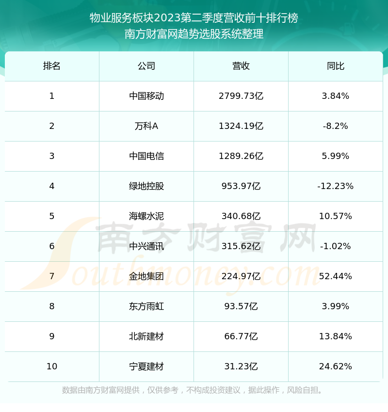 按照南方财富网趋势选股系统统计,该股所属板块为物业服务板块,该板块共有21只股票,锦和商管2023第二季度营收在该板块中排名为第18名,该板块2023第二季度营收排名前十的股票如下表: